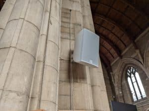 The church’s existing 100V audio system had been designed purely for speech amplification and no longer reflected the needs of a worship team which plays as a band with drums, keyboard, electric and acoustic guitars, and multiple singers. The old speakers positioned on the exterior walls struggled to provide coverage for the full congregation and the system lacked the flexibility to facilitate the church’s busy programme of worship, education, and community events.